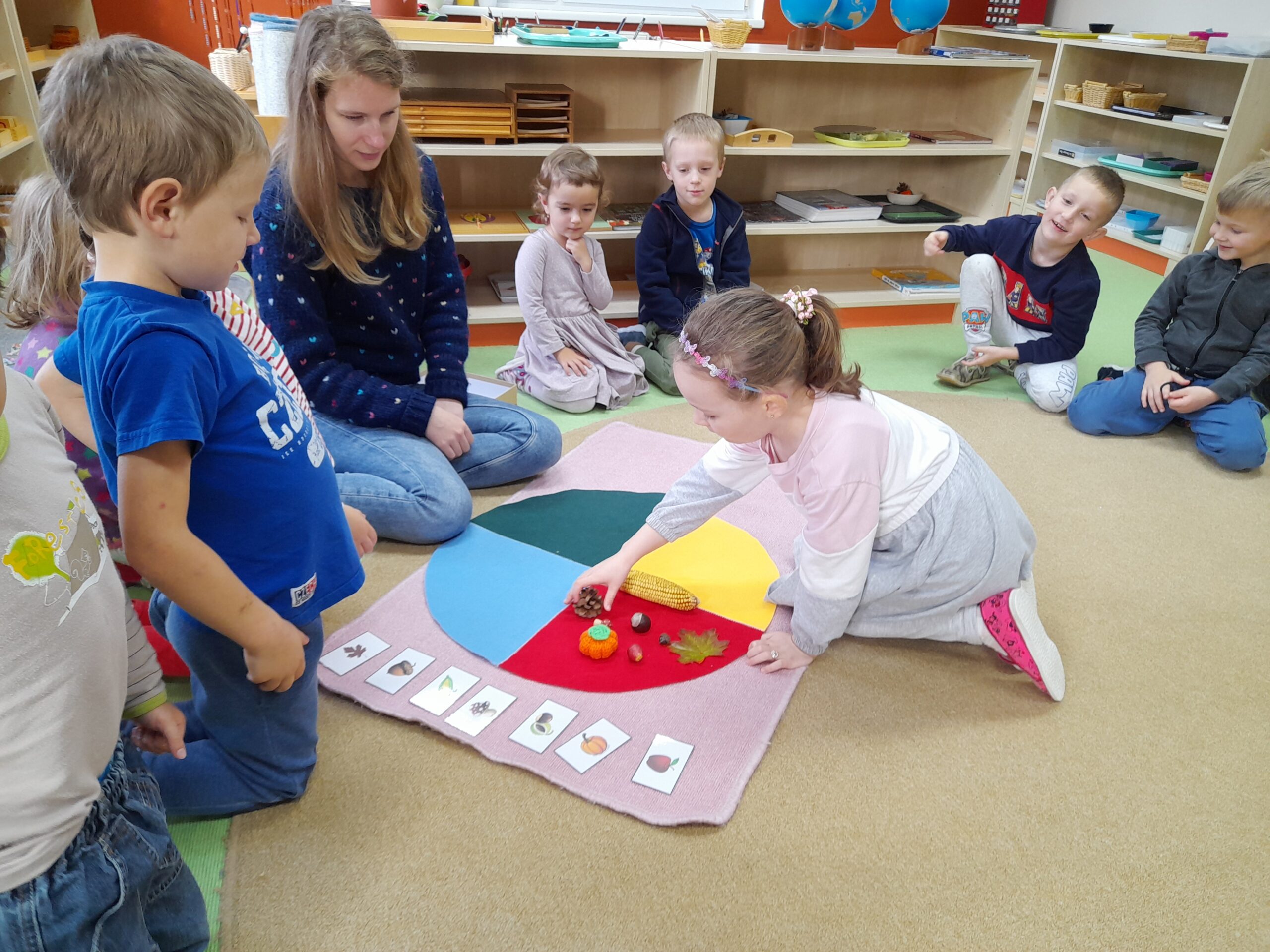 Nenajdete u nás nudící se dítě. Nenajdete u nás ani hračky (kromě těch odložených u vstupu do třídy). Najdete děti v kruhu svých kamarádů nad vybranou aktivitou nebo samotné dítě sedící u stolu u vybrané aktivity, experimentu či tvoření. Najdete u nás své dítě, které si „čte“, i když děti kolem staví věž z kostek (aniž by věděly, že poznávají desítkovou soustavu) nebo si ukazují, jak se tvoří dvouciferná čísla.